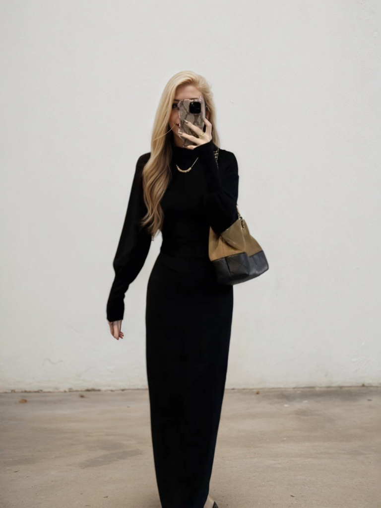 整體呈現為 修身合身、線條流暢,半高領設計修飾頸部比例,腰身自然貼合,能清楚勾勒身形曲線,裙身垂墜感佳,行走時帶有柔和延伸感。