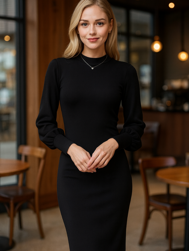 新款半高領燈籠袖修身復古針織洋裝K1047 (黑)