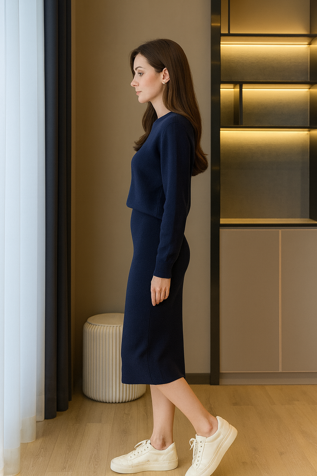 整體呈現為 自然修身、不貼身的舒適版型,上身帶有適度寬鬆感,下身裙型順著身形延伸,線條柔和、比例俐落。