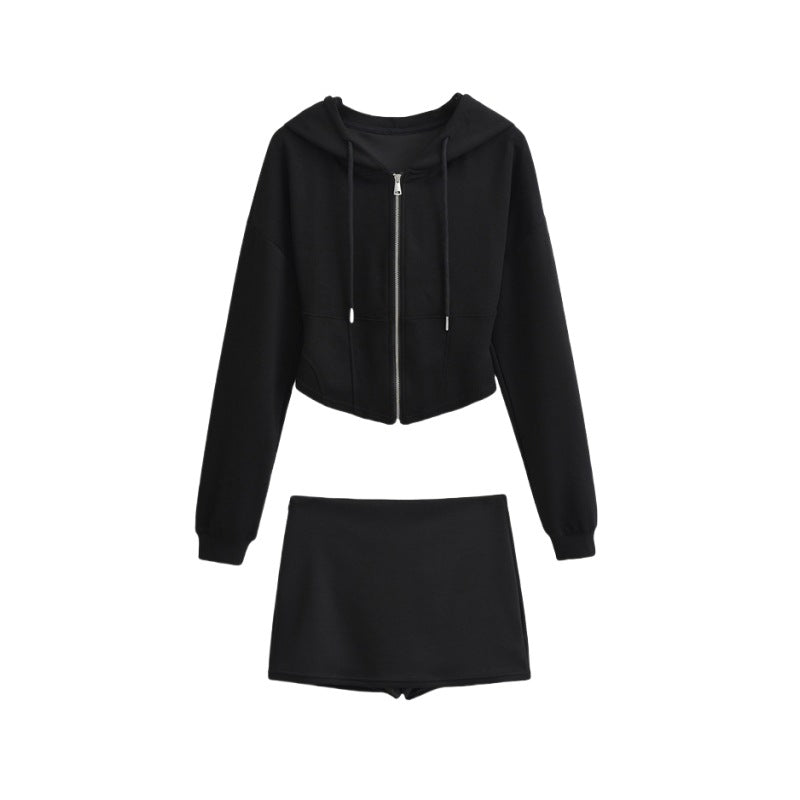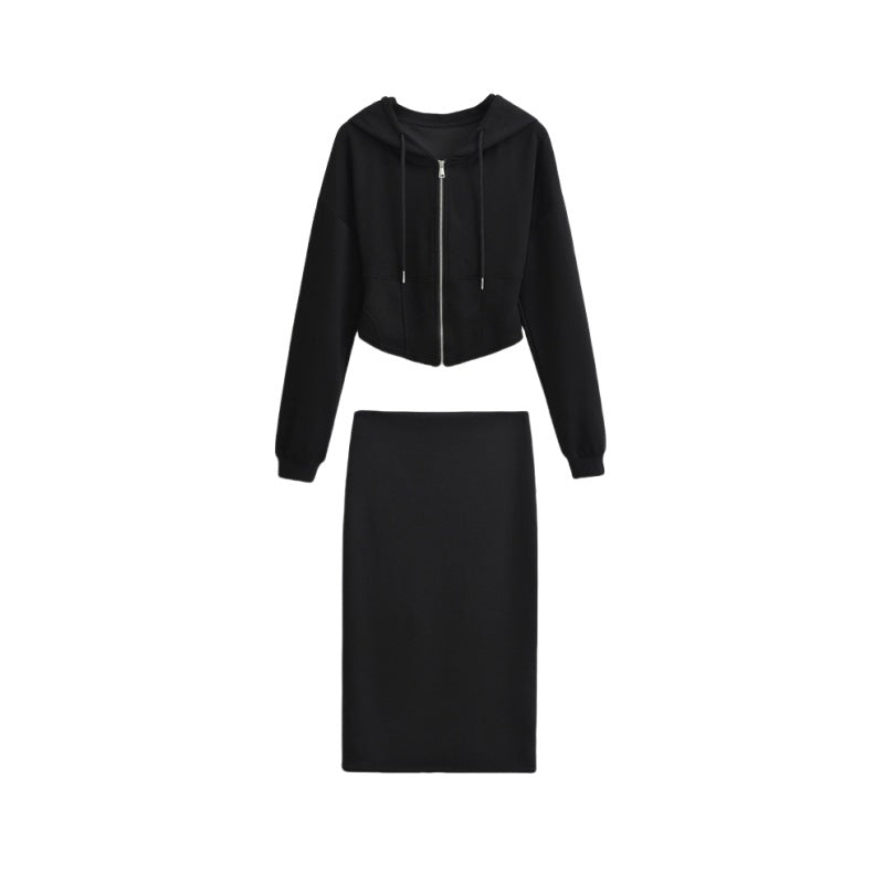 連帽抽繩高腰長裙、短裙套裝(黑)