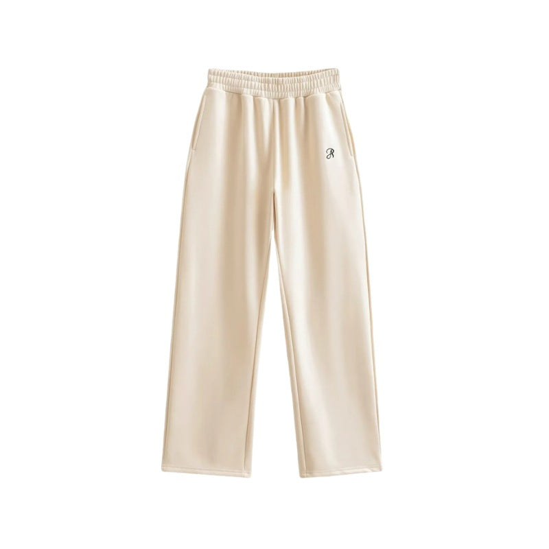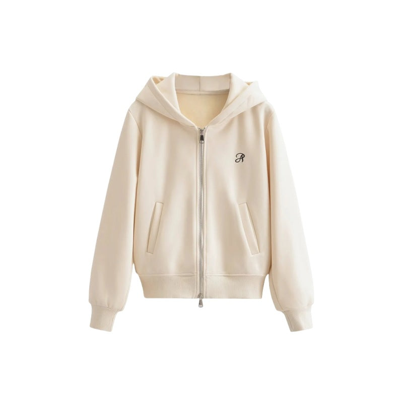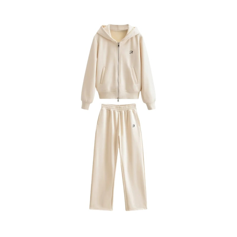 連帽拉鍊加絨刺繡寬鬆休閒套裝(米白)