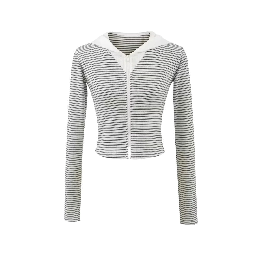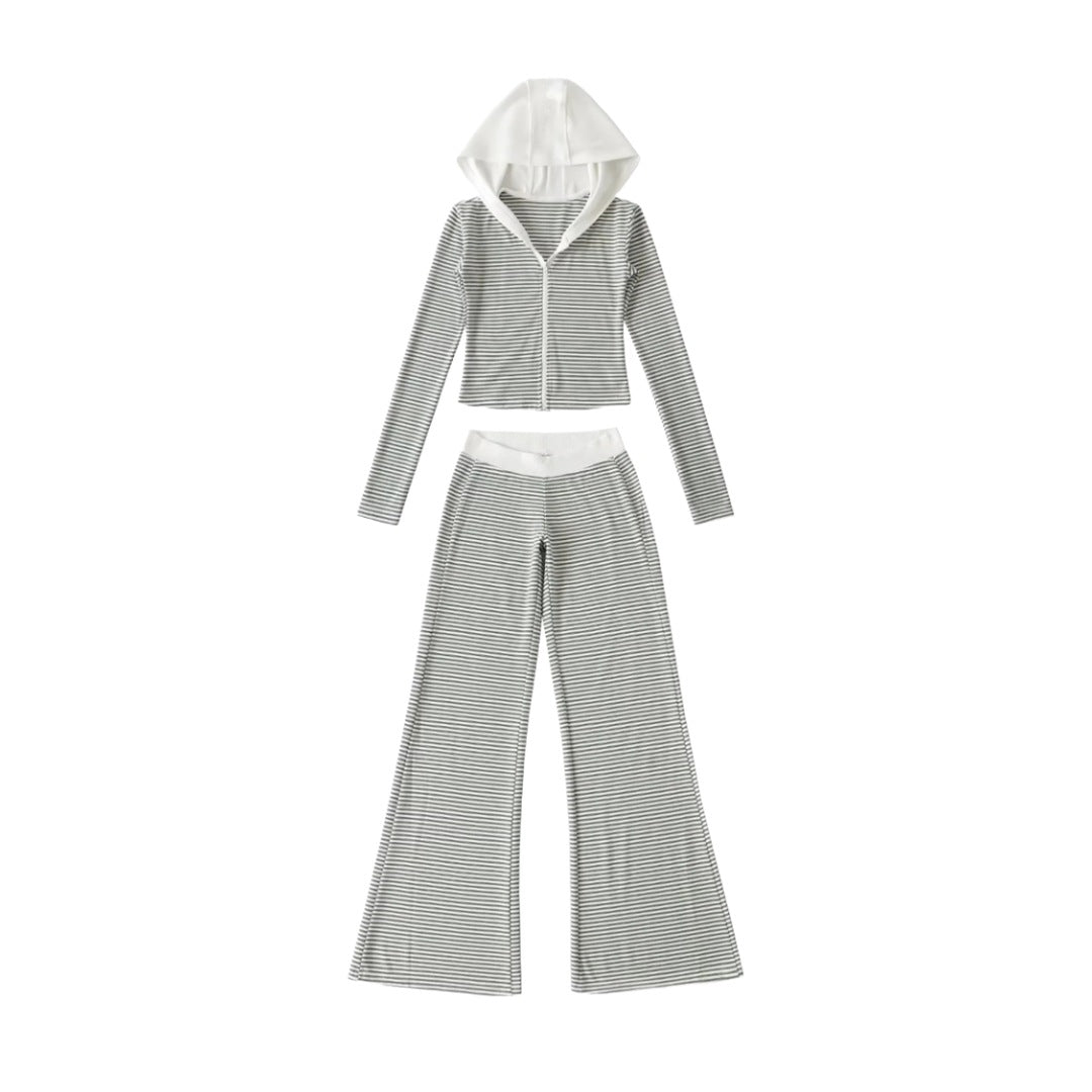 連帽拉鍊條紋撞色長袖休閒套裝(白)