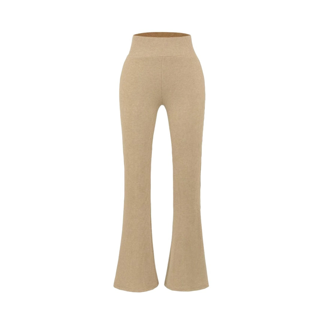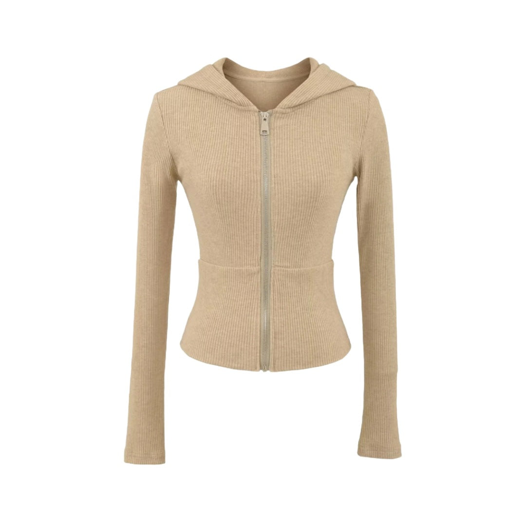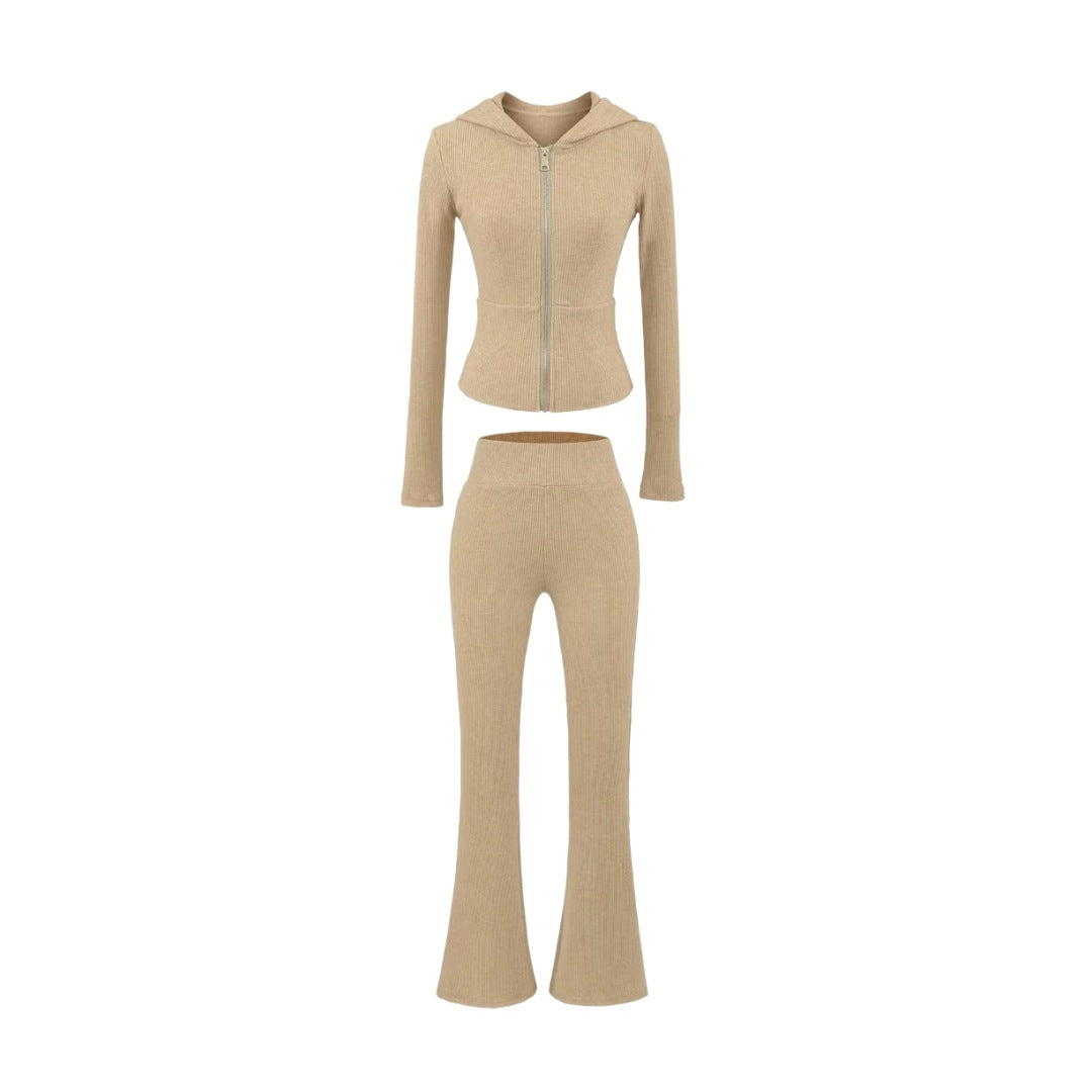 高腰性感連帽拉鍊微喇叭褲套裝(卡其)