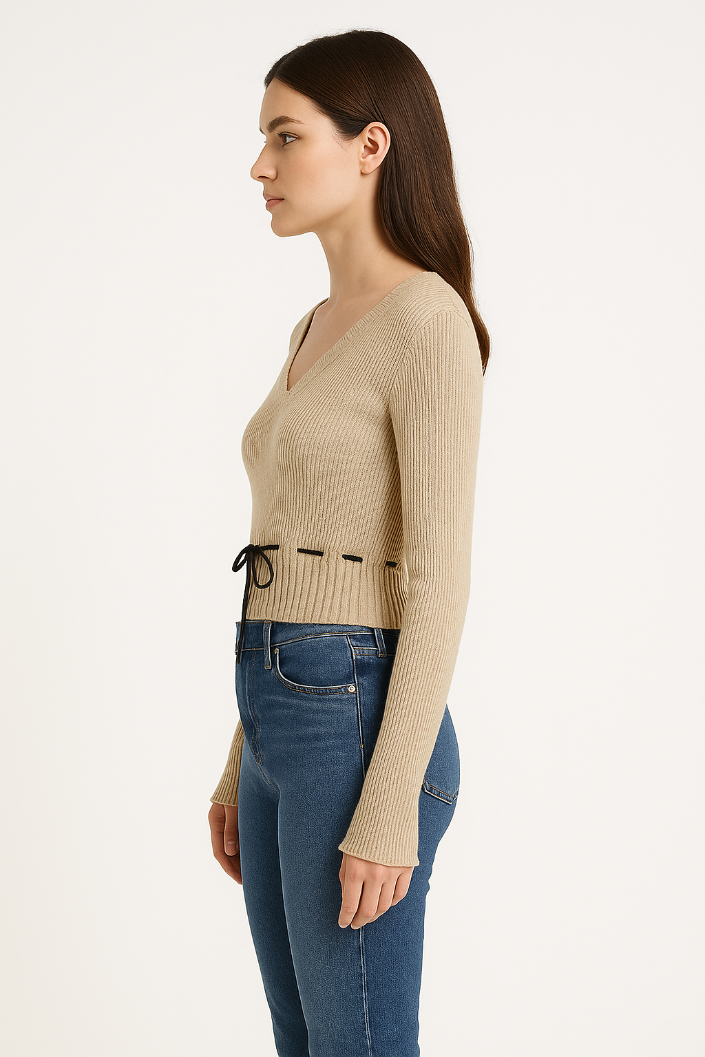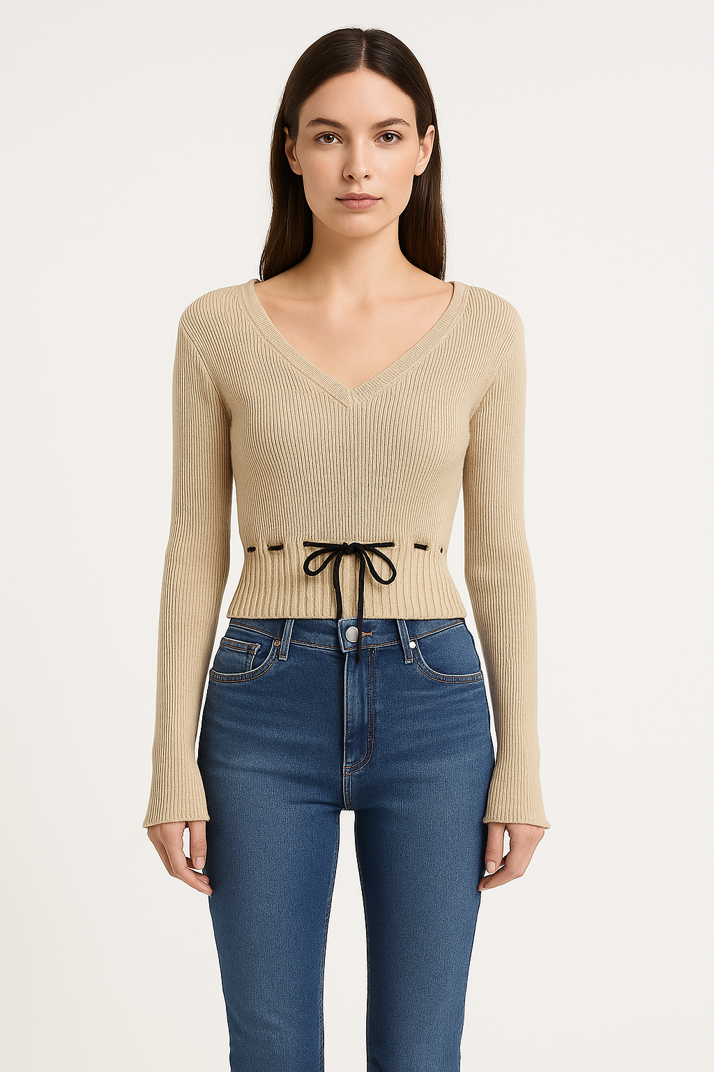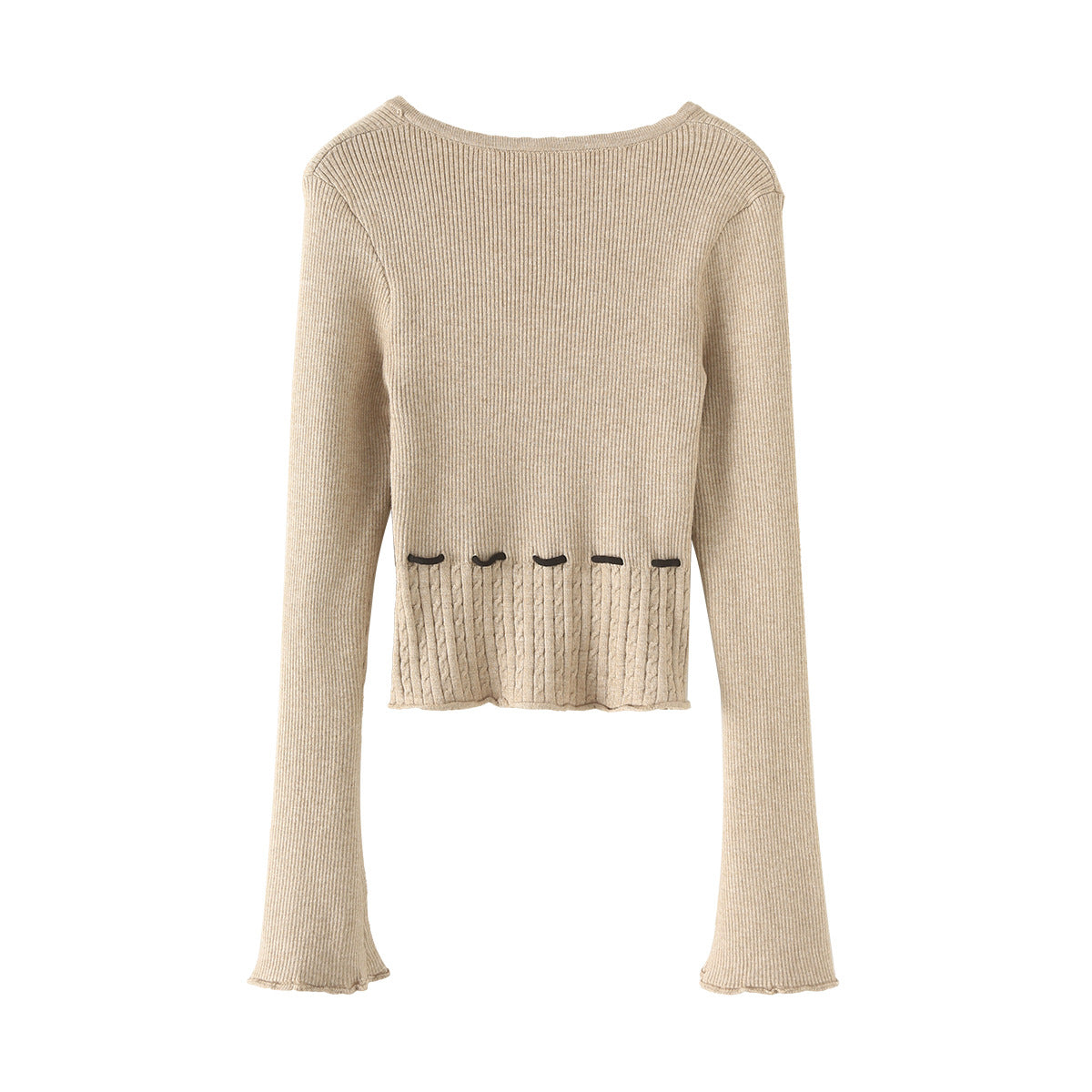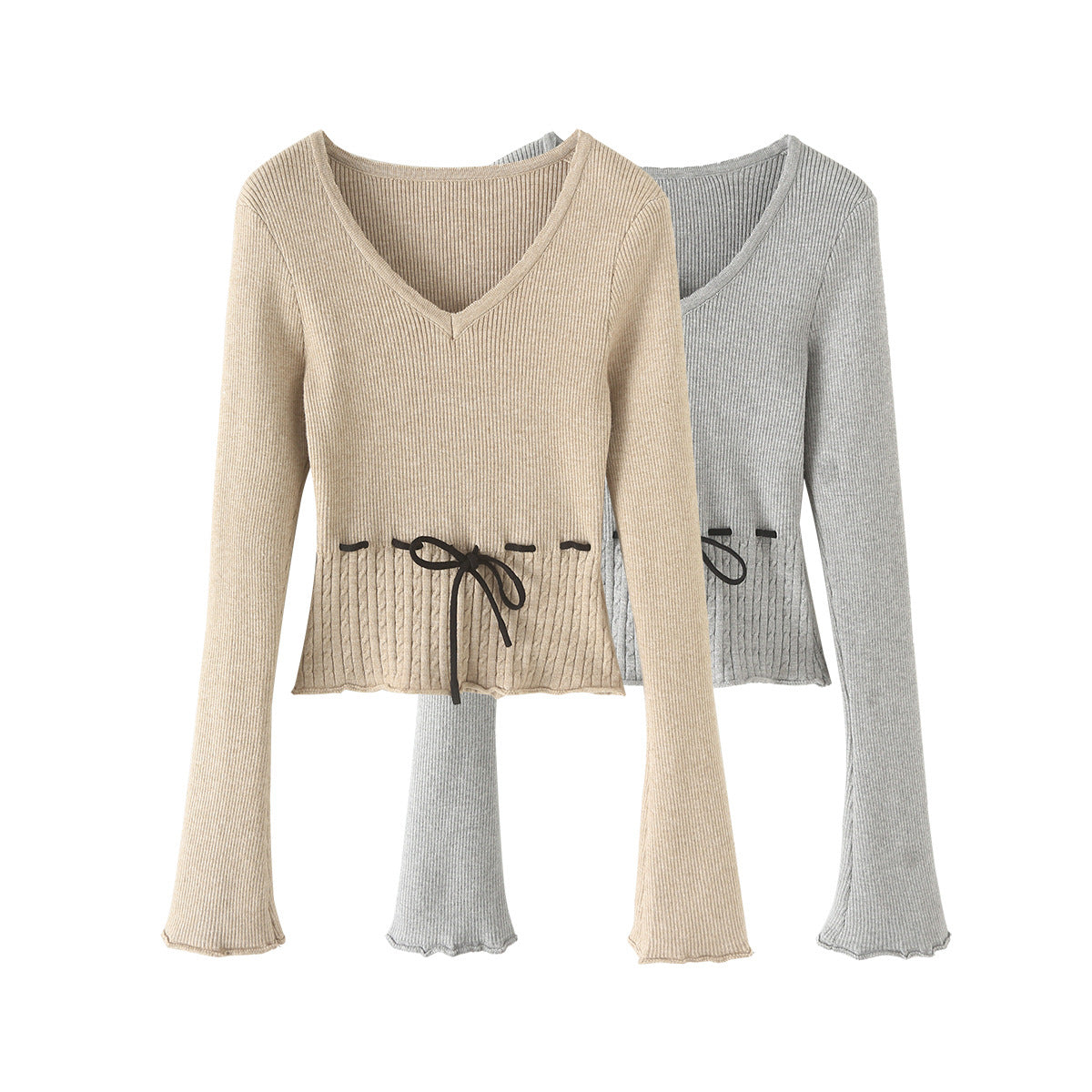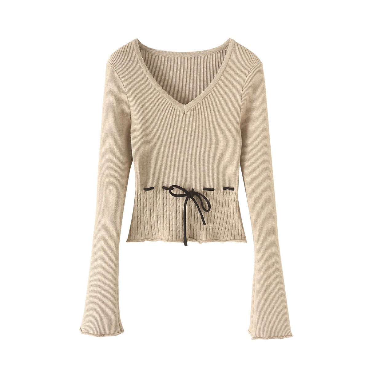 V字領抽繩收腰喇叭袖針織衫(卡其)KN1004
